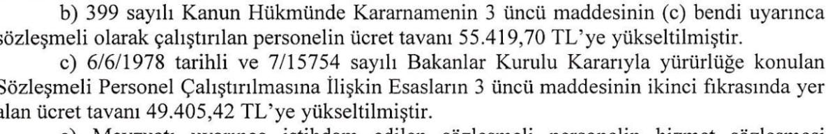 Sözleşmeli olarak çalıştırılan personelin ücret tavanı 55 bin 419,70 TL'ye yükseltildi. Sözleşmeli Personel Çalıştırılmasına İlişkin Esasların 3 üncü maddesinin ikinci fıkrasında yer alan ücret tavanı 49 bin 405,42 TL'ye çıkartıldı.