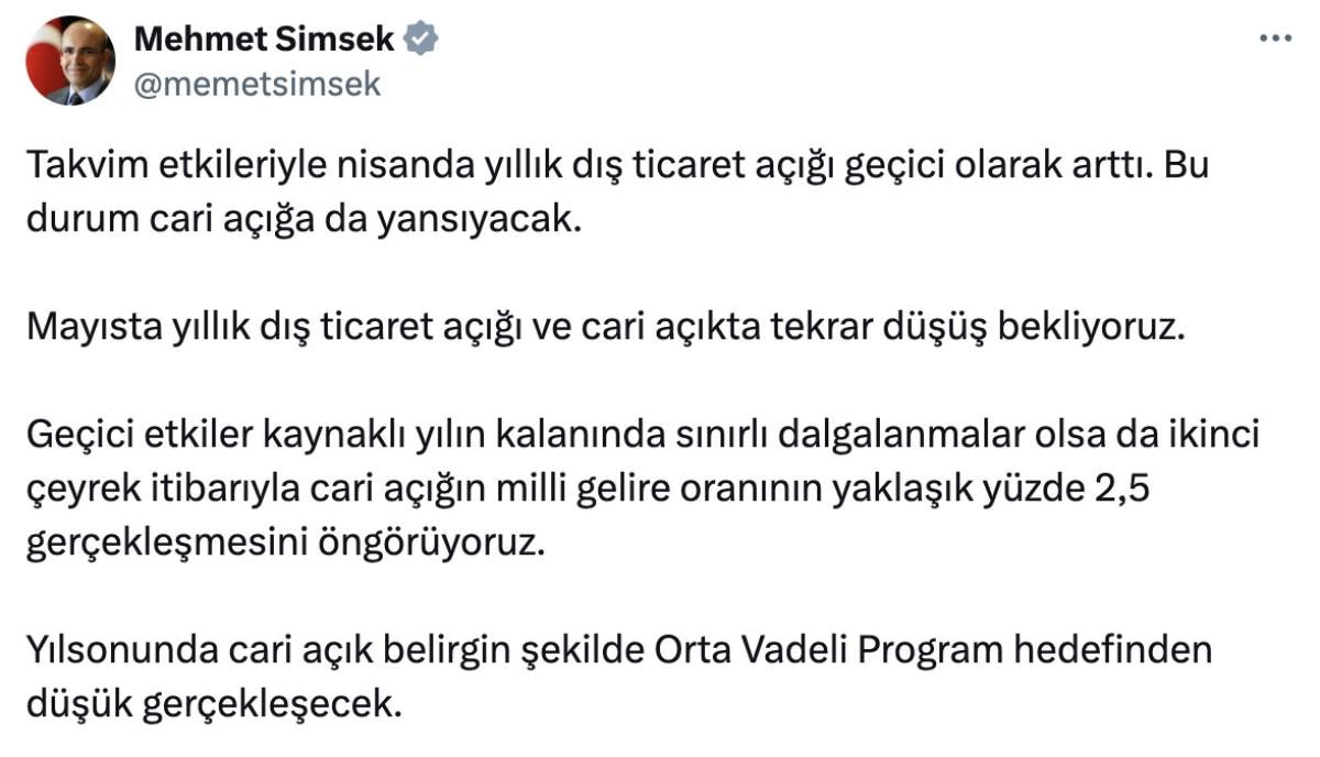 Hazine ve Maliye Bakanı Mehmet Şimşek, ekonomistlerin 9 ayın en yüksek dış ticaret açığı olarak nitelendirdiği rakama ilişken sosyal medya hesabı üzerinden şu açıklamada bulundu: