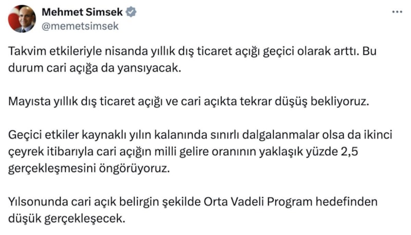 Hazine ve Maliye Bakanı Mehmet Şimşek, bugün TÜİK'in açıkladığı nisan ayına ait dış ticaret rakamlarını değerlendirdi. Bakan Şimşek, cari açığa yansıyan dış ticaret açığının nisanda yüksek geldiğini belirterek bunun takvim etkilerinden kaynaklandığını aktardı.