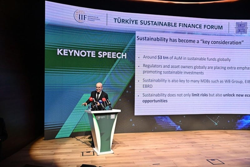 Hazine ve Maliye Bakanı Mehmet Şimşek, Uluslararası Finans Enstitüsü (IIF) ve Türkiye Bankalar Birliği (TBB) iş birliğiyle, İstanbul Finans Merkezi Ziraat Bankası Genel Müdürlük Oditoryumu'nda düzenlenen "Türkiye Sürdürülebilir Finans Forumu"nda konuştu.