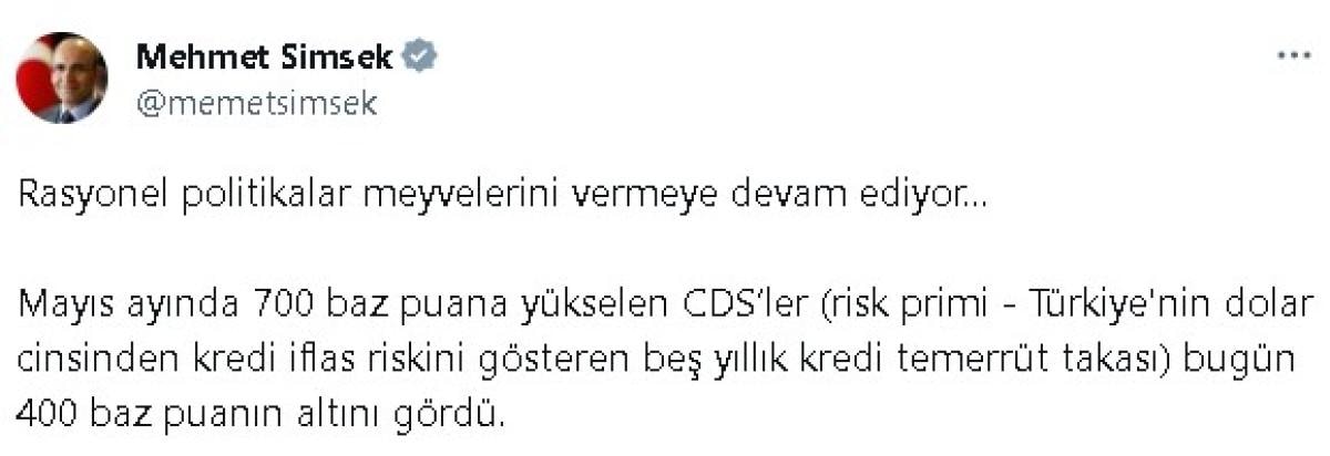 Mayıs ayında 700 baz puana yükselen CDS’ler (risk primi - Türkiye'nin dolar cinsinden kredi iflas riskini gösteren beş yıllık kredi temerrüt takası) bugün 400 baz puanın altını gördü.