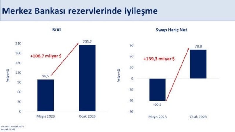 Brüt rezervler yaklaşık 107 milyar dolar artarak 205,2 milyar dolara ulaştı.