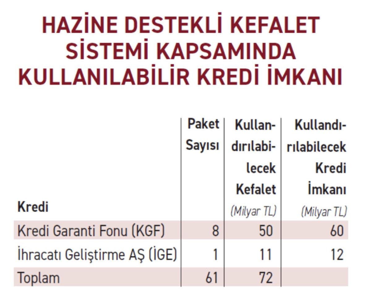 Halihazırda Hazine Destekli Kefalet Sistemi kapsamında 109 milyar TL kefalet karşılığında, 128 milyar TL kredi hacmi sunan 9 adet destek paketi yürürlükte Bu paketlerden 48 milyar TL kefalet karşılığında 56 milyar TL kredi kullandırıldı. 61 milyar TL kefalet karşılığı kullandırılabilecek 72 milyar TL kredi imkanı var. Yürürlükteki destek paketlerinin yüzde 55’i hala kullanılabilir durumda.
