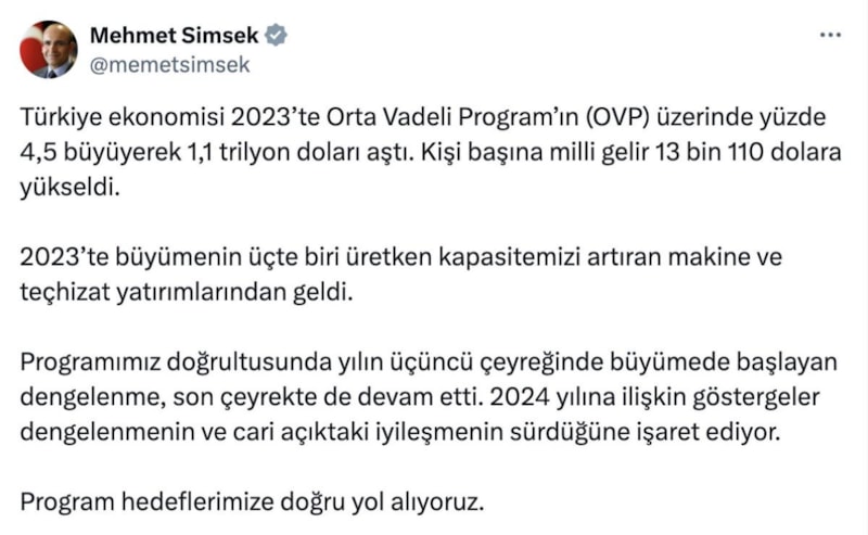 Hazine ve Maliye Bakanı Mehmet Şimşek, büyüme verisinin açıklanmasının ardından sosyal medyada yayınladığı mesajında, yaşanan olumlu gelişmeyi şu sözlerle gözler önüne serdi: