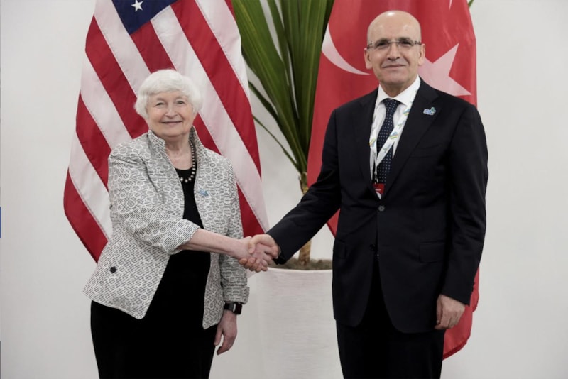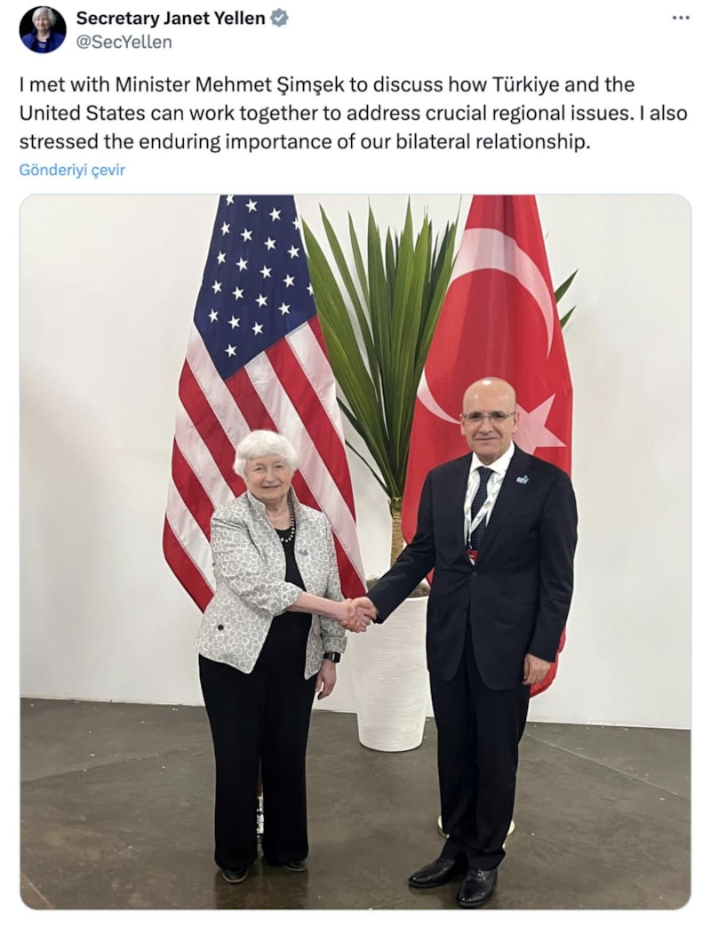 G20 Maliye Bakanları ve Merkez Bankası Başkanları toplantısında bir araya gelen ABD Hazine Bakanı Janet Yellen, Hazine ve Maliye Bakanı Mehmet Şimşek ile görüşmesini sosyal medya hesabından paylaştı.