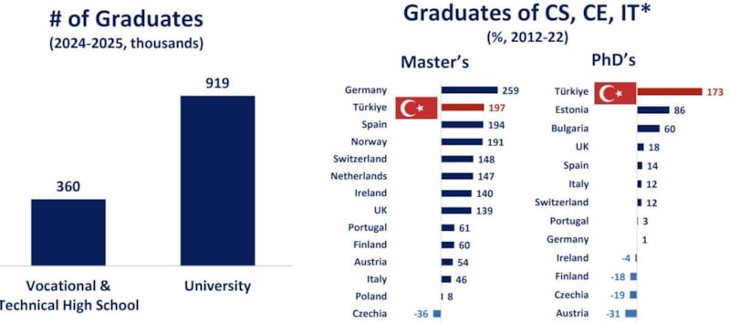 Stanford'un bir çalışmasına göre gelecekte Türkiye'nin dijital dönüşüm açısından önemli alanlardaki doktora ve yüksek lisans derecelerinin sayısı bakımından üst sıralarda yer alacağını belirten Şimşek, bir diğer destek için de şu bilgiyi verdi: