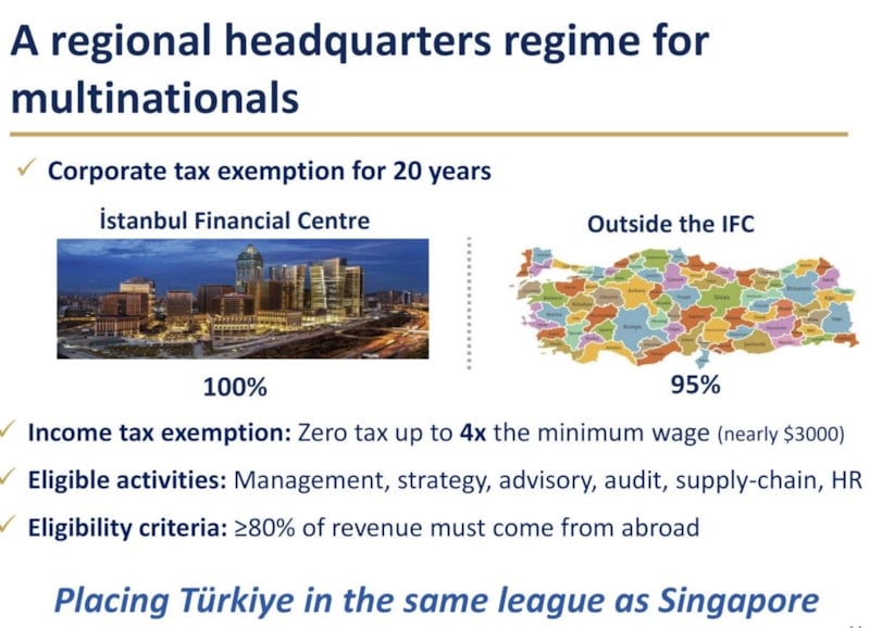 Bir diğer destek daha fazla yetenek, sermaye, girişimci, start-up ya da yüksek varlıklı birey çekmek. Burada da eğer bölgesel merkezinizi İstanbul Finans Merkezine taşırsanız 20 yıl boyunca kurumlar vergisi istisnası sağlanıyor. Merkezinizi Türkiye'de İstanbul Finans Merkezi dışında bir yere taşırsanız yüzde 95 kurumlar vergisi istisnası var. Gelir vergisi istisnası da asgari ücretin 4 katına kadar uygulanacak. Şu anda bu yaklaşık 2 bin 900 dolar civarında. Yani neredeyse 3 bin dolara kadar istisna anlamına geliyor. Bunun üzerindeki gelirler için gelir vergisi ödenecek ancak yaklaşık 3 bin dolara kadar olan kısım gelir vergisinden muaf olacak. Kapsama her türlü hizmet dahil edilecek. Yönetim, danışmanlık, denetim, tedarik zinciri, insan kaynakları. Tek kriter, gelirin yüzde 80'inin Türkiye dışından elde edilmesi. Yüzde 20'ye kadarı yerel olabilir. Böylece Türkiye'yi bu alanda Singapur ile aynı lige yerleştiriyoruz. Referanslarımız genellikle Singapur, Hollanda gibi yerler.