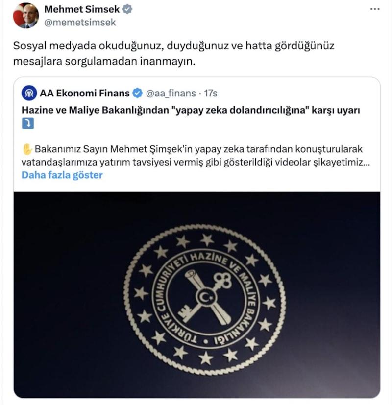 Hızla yayılan bu dolandırıcılık videolarının sahte olduğunu anlamak oldukça zordur. Mağduriyet yaşanmaması için tüm vatandaşlarımızı her zamankinden daha dikkatli olmaya davet ediyoruz ve bu tür videolara inanarak yatırım yapmamaları konusunda uyarıyoruz. Bakanımız Sayın Mehmet Şimşek'in de yapay zeka tarafından konuşturularak vatandaşlarımıza yatırım tavsiyesi vermiş gibi gösterildiği videolar şikayetimizle sosyal medya mecralarından kaldırılmıştır. Ayrıca vatandaşlarımızın yatırım tercihlerine yönelik olarak Sayın Bakanımızın herhangi bir tavsiyesi olmayacağı da aşikardır.