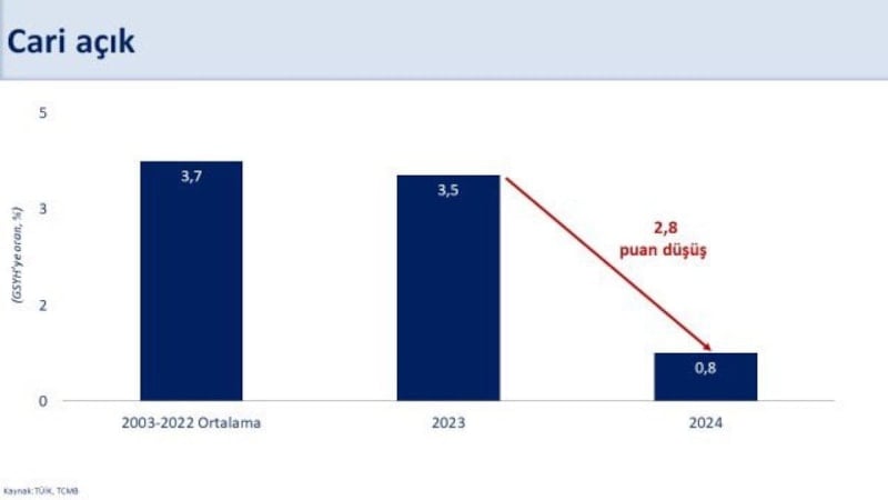 Sanayi katma değerinin iki çeyreğin ardından pozitife döndüğünü ve son çeyrekte üretim tarafından tüm sektörlerin büyümeyi desteklediğini anlatan Şimşek, "Potansiyel büyümemiz için önemli olan makine teçhizat yatırımları son çeyrekte yüzde 4,2 büyüdü. 2024 yılında iç talebin 2,1 puan, net dış talebin 1,1 puan katkısıyla dengeli bir büyüme gerçekleşti. Böylece cari açığın milli gelire oranı 2,8 puan gerileyerek 2024'te yüzde 0,8 oldu. Azalan cari açık dış finansman ihtiyacının gerilemesine, rezerv birikimine ve ekonomik istikrarın güçlenmesine önemli katkı sağladı." değerlendirmesinde bulundu.