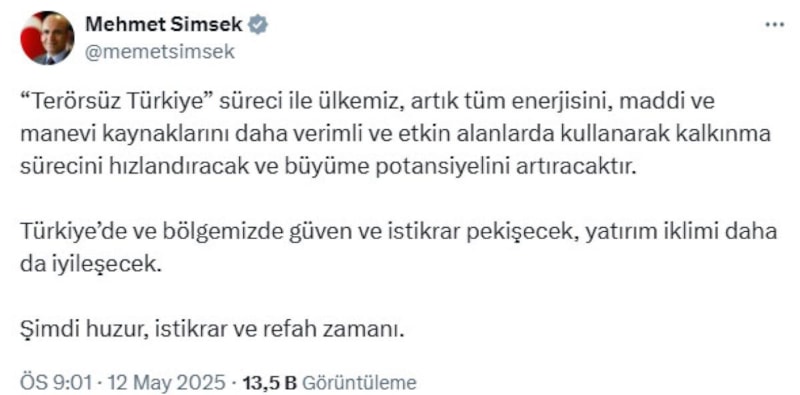 PKK'nın kendisini feshettiğini duyurmasını değerlendiren Hazine ve Maliye Bakanı Mehmet Şimşek, "Türkiye’de ve bölgemizde güven ve istikrar pekişecek, yatırım iklimi daha da iyileşecek. Büyüme potansiyelini artıracak" dedi.