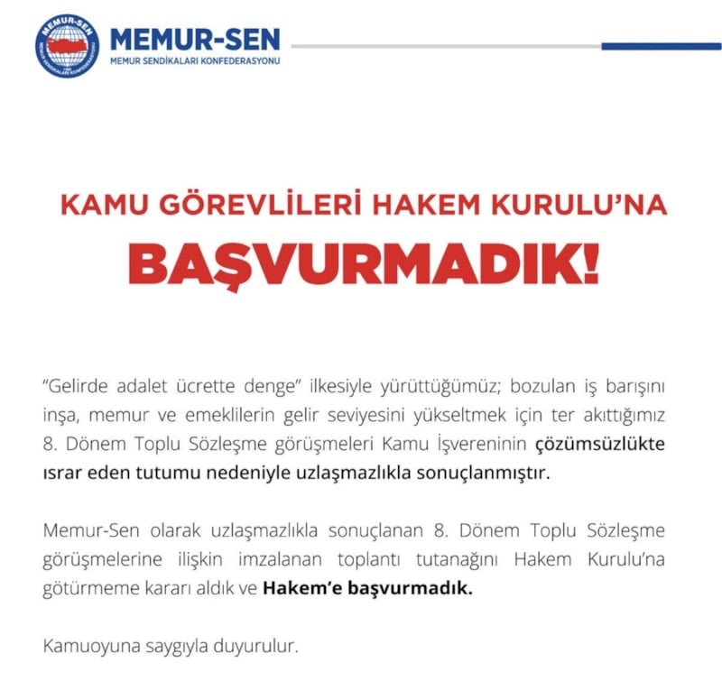 Ancak geçtiğimiz dakikalarda yeni bir açıklama daha yapan Memur-Sen, hakem heyetine başvurmadıklarını belirtti.