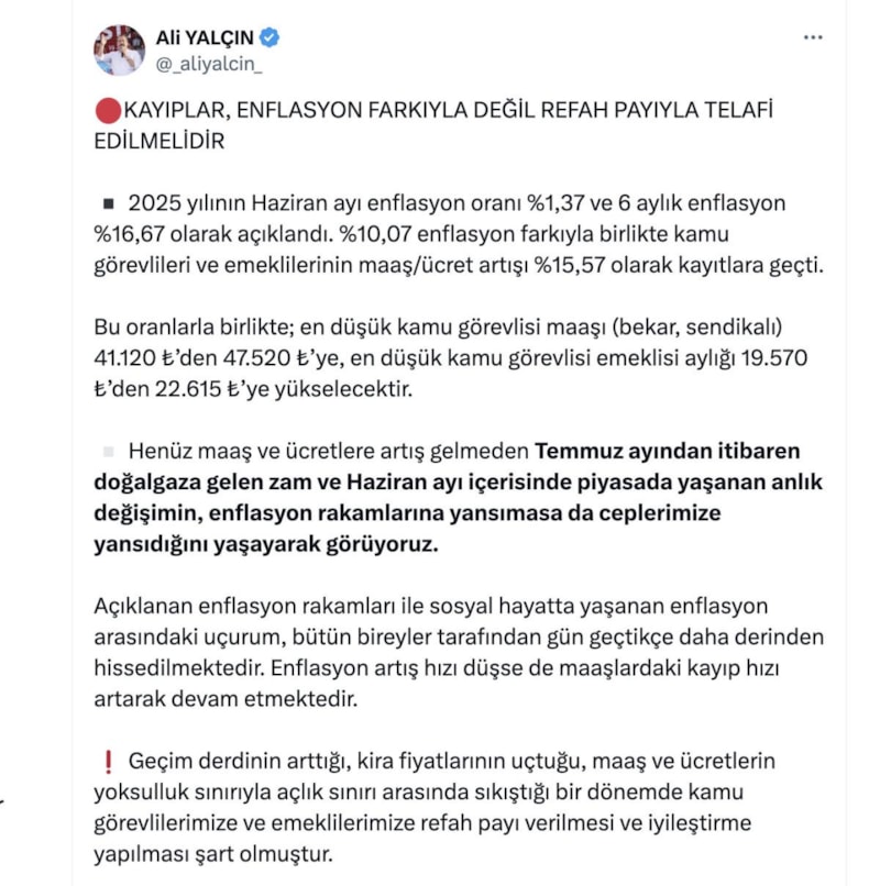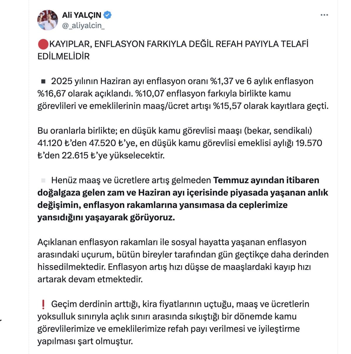 Memur-Sen Genel Başkanı Ali Yalçın, X hesabından "Kayıplar, enflasyon farkıyla değil refah payıyla telafi edilmelidir." diyerek şu verileri paylaştı:
