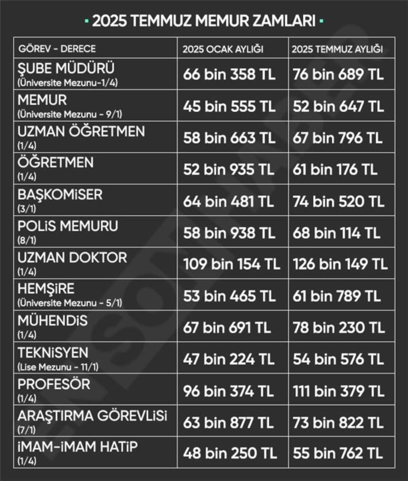 Bu oranlarla birlikte; en düşük kamu görevlisi maaşı (bekar, sendikalı) 41 bin 120 TL’den 47 bin 520 TL’ye, en düşük kamu görevlisi emeklisi aylığı 19 bin 570 TL’den 22 bin 615 TL ’ye yükselecektir.