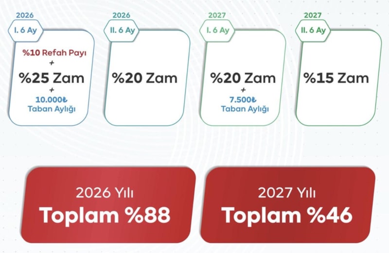 {10.000 TL (Taban Aylığı)+ yüzde 10 (Refah Payı) + yüzde 25} + {yüzde 20} olmak üzere toplamda yüzde 88 artış.