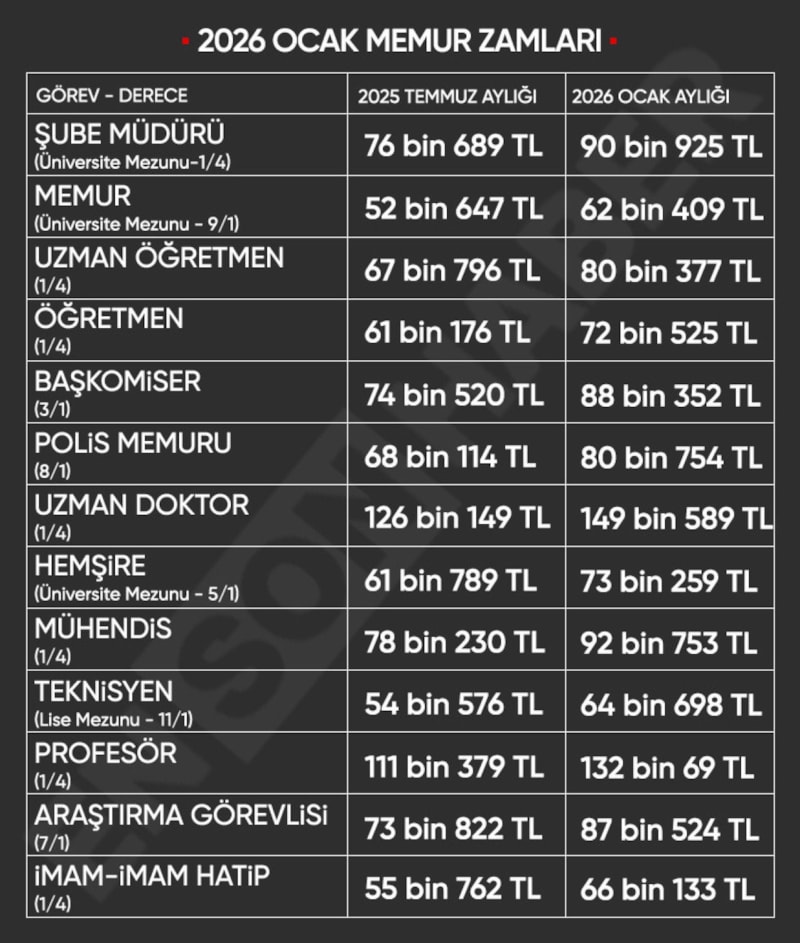Buna göre 2026 yılı ocak ayında zamlı memur maaşlarında olacak değişiklikler şöyle: