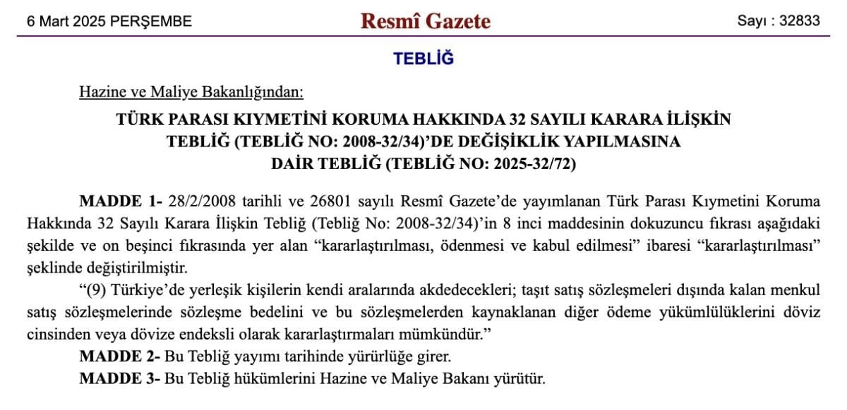 Böylece, taşıt satış sözleşmeleri dışında kalan menkul satış sözleşmelerinde ödeme yükümlülüklerinin döviz cinsinden veya dövize endeksli olarak yerine getirilmesi mümkün hale geldi.
