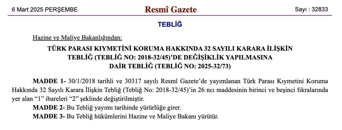 Hazine ve Maliye Bakanlığı'nın "Türk Parası Kıymetini Koruma Hakkında 32 Sayılı Karara İlişkin Tebliğ"i Resmi Gazete'de yayınladı.