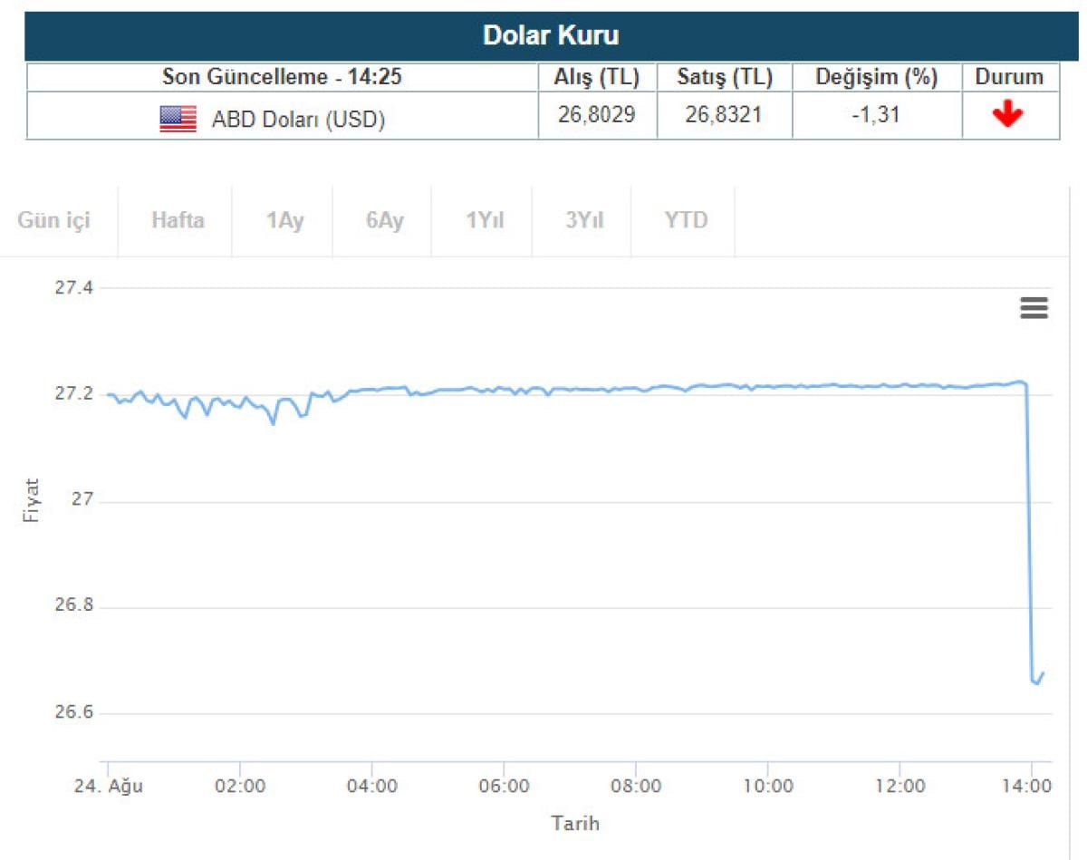 Dolar, karar sonrasında ilk refleks olarak yüzde 2 düşerek 27,2164 liradan 26,6779 liraya geriledi. Günün kapanışında ise toplam yüzde 7 düşüşle 25,7510 liraya kadar indi.