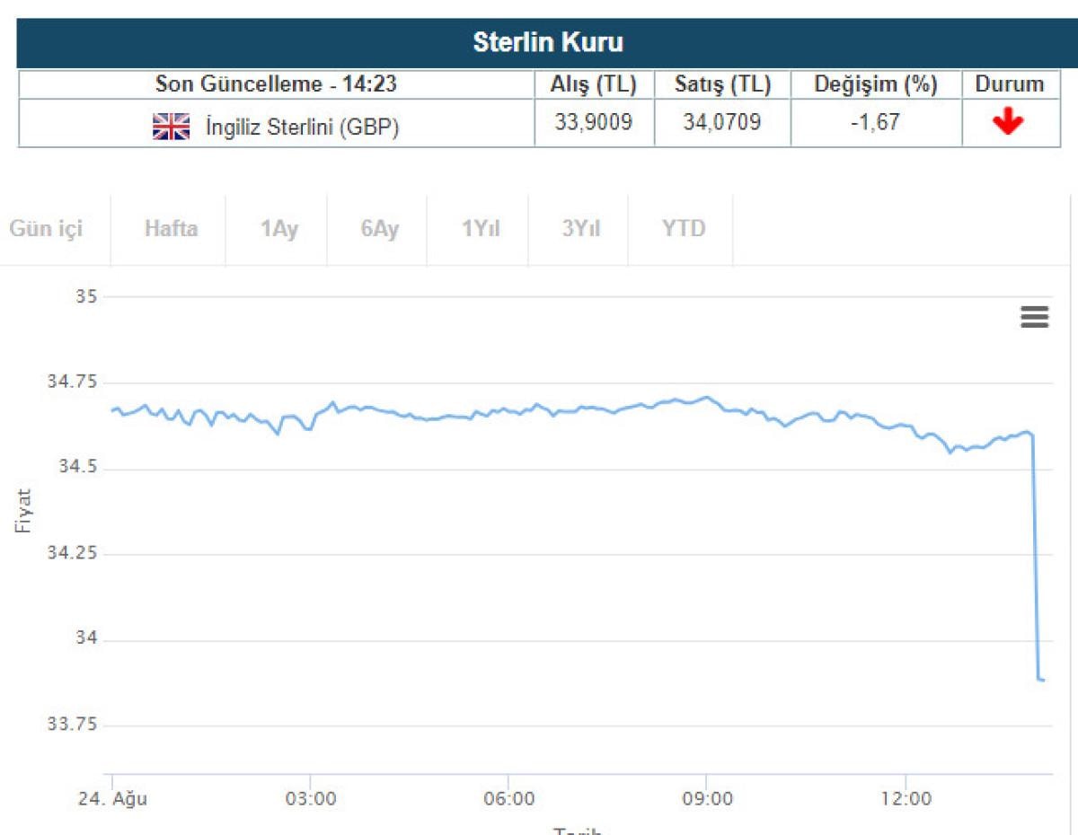 Sterlin, karar sonrasında ilk refleks olarak yüzde 0,13 düşüşle 34,6491 liradan 34,6050 liraya geriledi. Günün kapanışında ise toplam yüzde 5,5 düşüşle 32,7047 liradan işlem gördü.