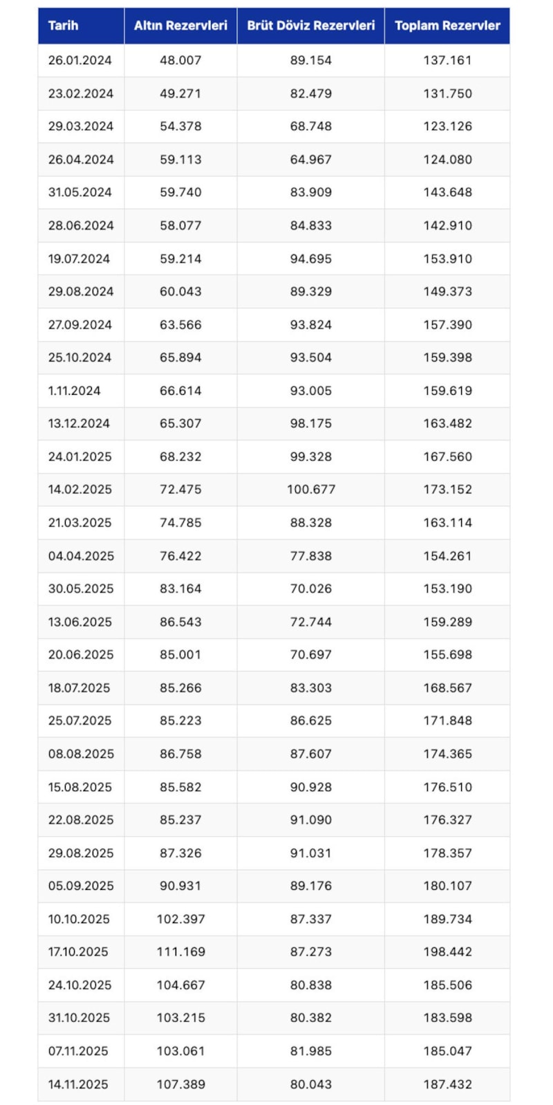 Türkiye Cumhuriyet Merkez Bankası'nın (TCMB) 14 Kasım haftasına ait toplam rezervleri açıklandı.