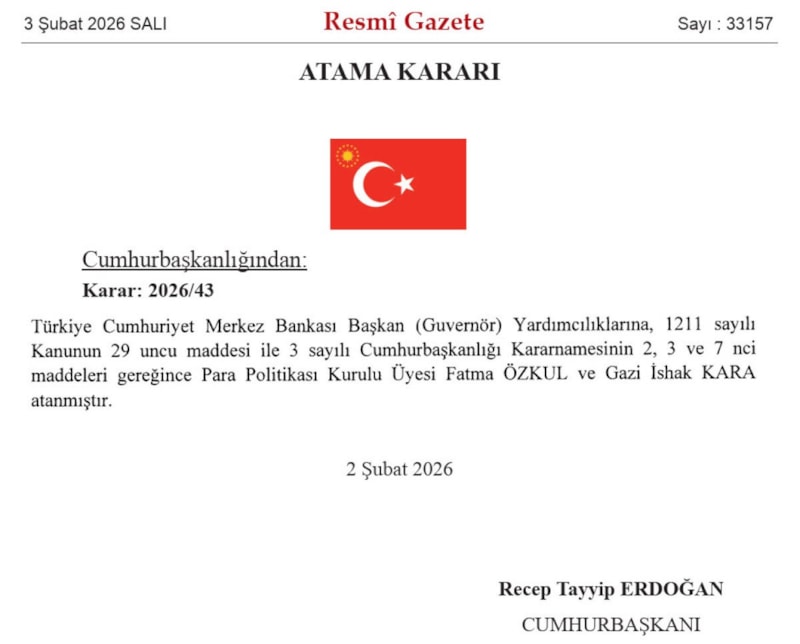 Cumhurbaşkanı Recep Tayyip Erdoğan'ın imzasıyla Resmi Gazete'de yer alan karara göre Türkiye Cumhuriyet Merkez Bankası'nda başkan yardımcılıklarına Fatma Özkul ile Gazi İshak Kara getirildi.