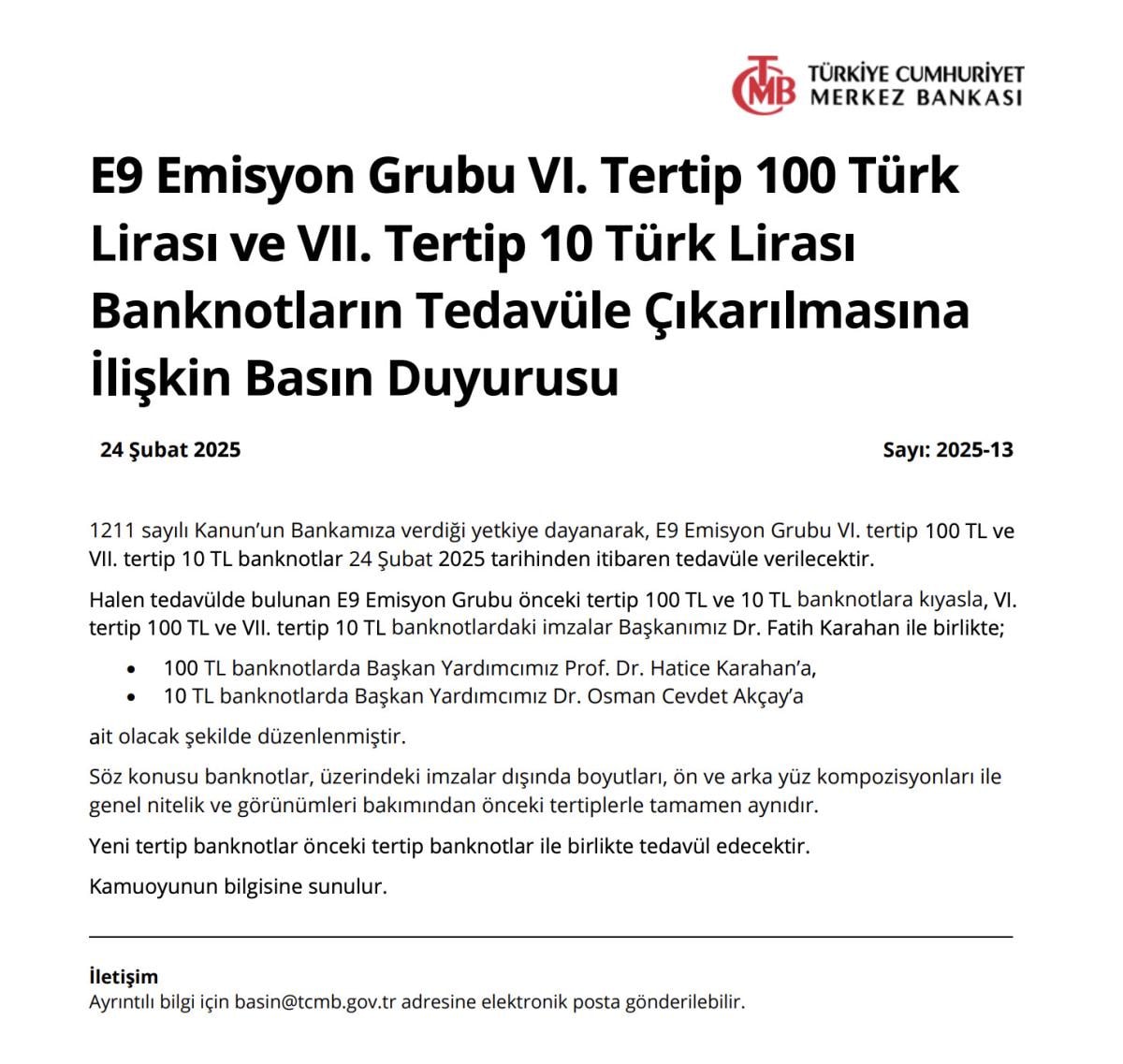 Yeni banknotlarda TCMB Başkanı Fatih Karahan, Başkan Yardımcısı Hatice Karahan ve Başkan Yardımcısı Osman Cevdet Akçay'ın imzaları bulunuyor.