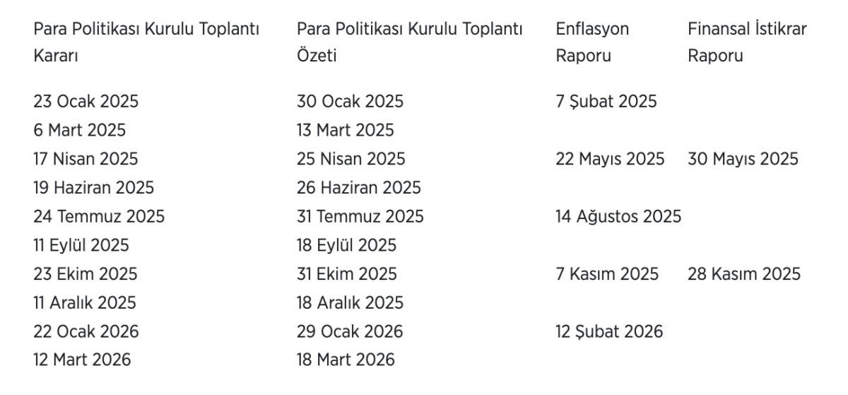 Merkez Bankasının 2025 yılına ilişkin yayımladığı takvim şöyle: