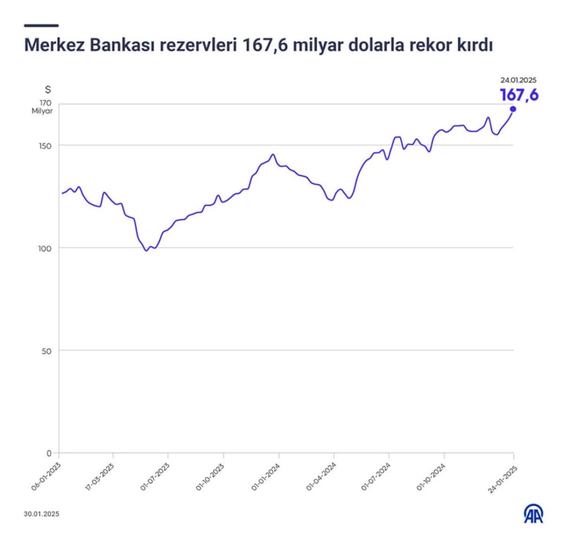 Merkez Bankası toplam rezervleri, 24 Ocak haftasında bir önceki haftaya göre 4 milyar 257 milyon dolar yükselişle 167 milyar 560 milyon dolara çıkarak rekor kırdı.