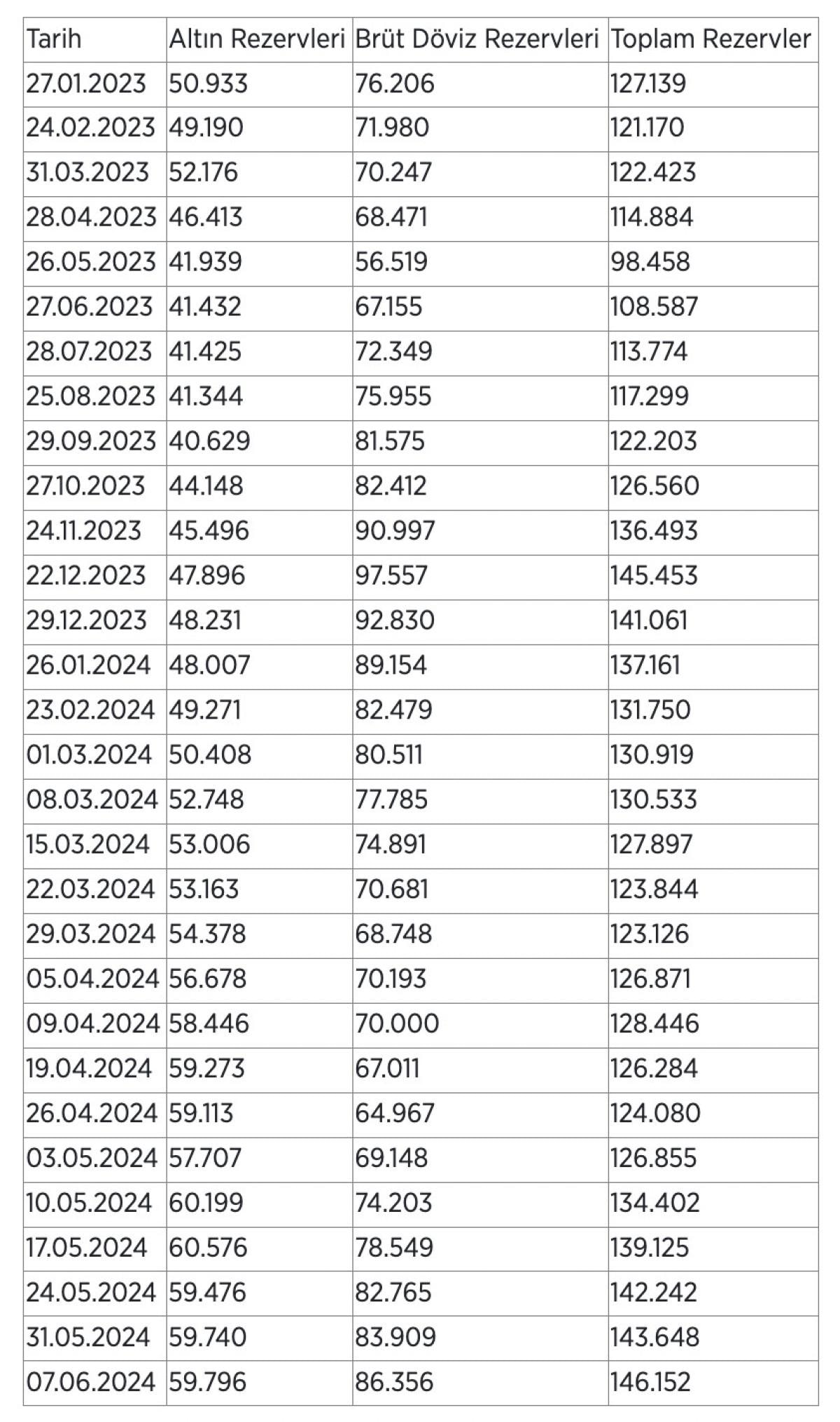 Bu dönemde altın rezervleri de 56 milyon dolar yükselişle 59 milyar 740 milyon dolardan, 59 milyar 796 milyon dolara çıktı.