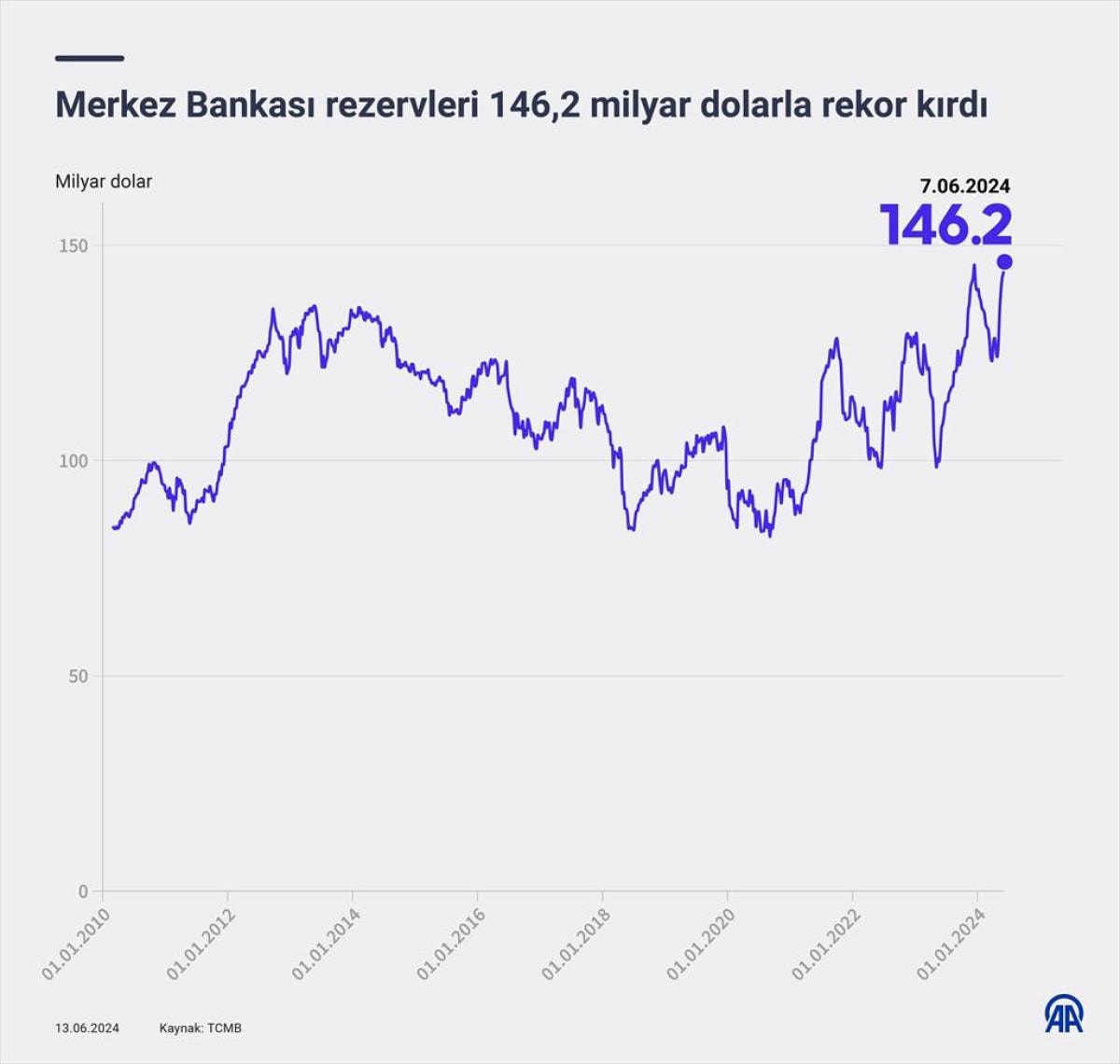 Buna göre, TCMB toplam rezervleri, 7 Haziran haftasında bir önceki haftaya göre 2 milyar 504 milyon dolar artışla 143 milyar 648 milyon dolardan 146,2 milyar dolara çıkarak, tüm zamanların en yüksek seviyesine ulaştı.