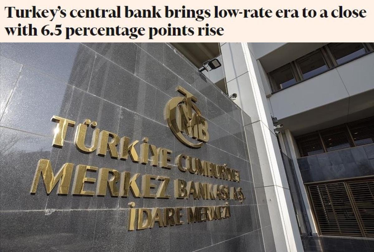 İngiltere merkezli Financial Times, Türkiye Cumhuriyet Merkez Bankası'nın düşük faiz dönemini 6,5 puanlık artışla kapattığını yazdı.