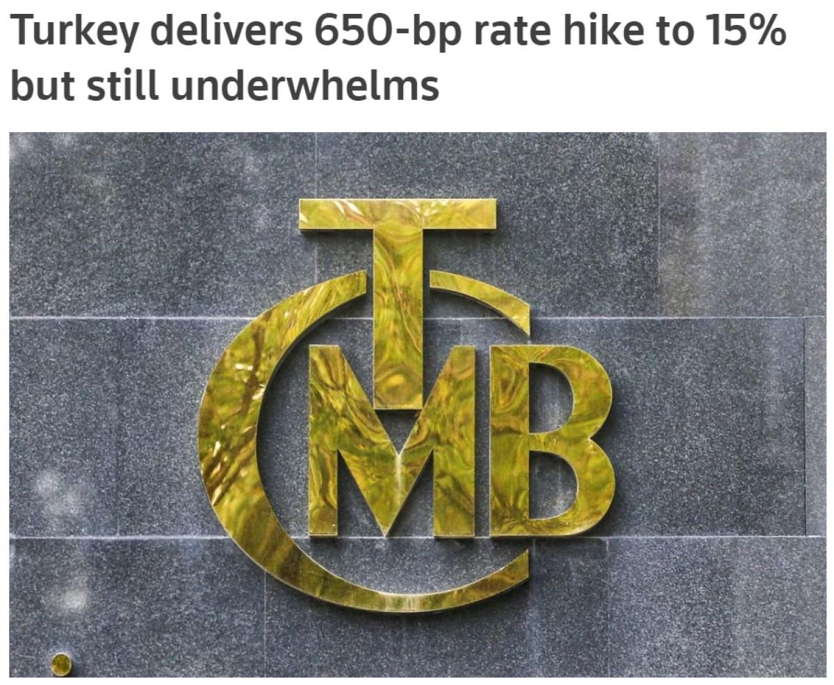 Reuters, Merkez Bankası'nın, faiz oranını 650 baz puan artırarak yüzde 15'e çıkardığını okurlarına aktardı.