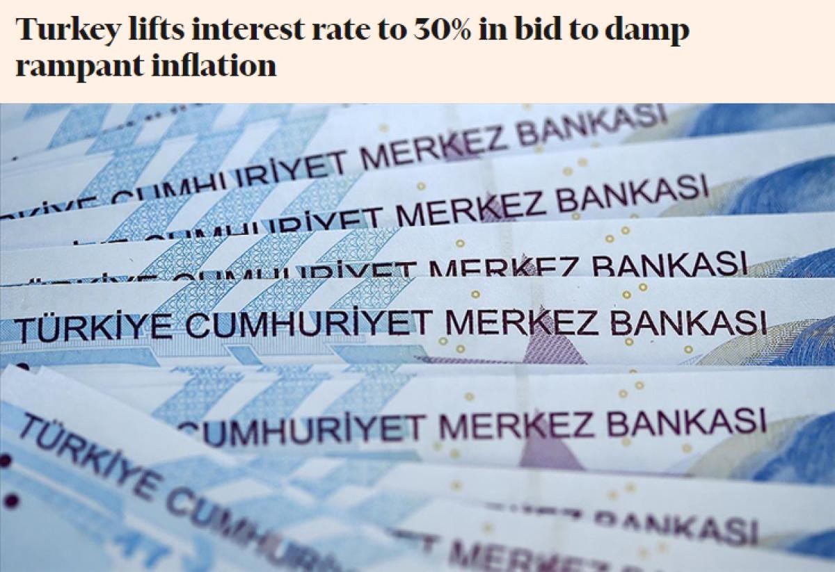 İngiltere merkezli Financial Times, "Türkiye, yüksek enflasyonu azaltmak amacıyla faiz oranını yüzde 30'a yükseltti." diye yazdı.