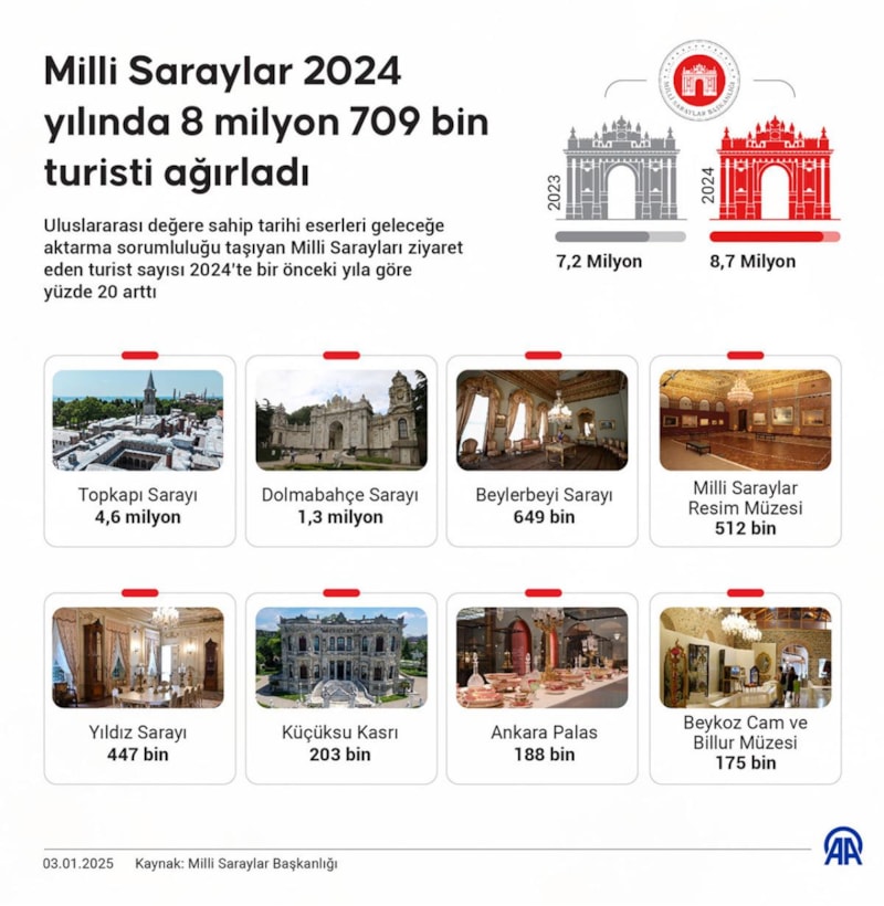 Milli Saraylar Başkanlığından yapılan açıklamaya göre, 2024'te Milli Sarayları ziyaret edenlerin sayısı, bir önceki yıla göre yüzde 20 artarak 7 milyon 261 bin 241'den, 8 milyon 709 bin 27'ye yükseldi.