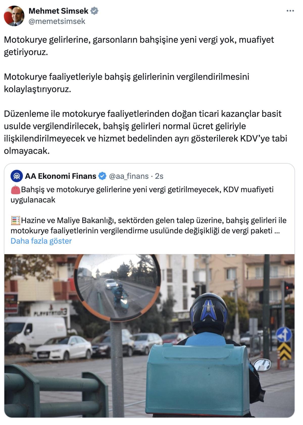 Konuya dair açıklama yapan Hazine ve Maliye Bakanı Mehmet Şimşek, "Motokurye gelirlerine, garsonların bahşişine yeni vergi yok, muafiyet getiriyoruz. Motokurye faaliyetleriyle bahşiş gelirlerinin vergilendirilmesini kolaylaştırıyoruz.