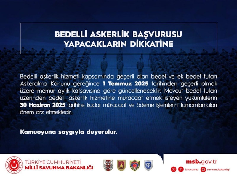MSB'den yapılan paylaşımda, bedelli askerlik hizmeti kapsamında geçerli olan bedel ve ek bedel tutarının 1 Temmuz'da güncelleneceği hatırlatılarak, "Mevcut bedel tutarı üzerinden bedelli askerlik hizmetine müracaat etmek isteyen yükümlülerin 30 Haziran 2025 tarihine kadar müracaat ve ödeme işlemlerini tamamlamaları önem arz etmektedir" denildi.