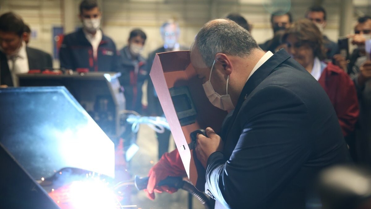 Bakan Varank, kaynak ve döküm sektöründe faaliyet gösteren bu fabrikayı ziyaretinde kaynak gözlüğü ve eldiven takarak, bir süre plakaları kaynak işlemiyle birleştirdi.