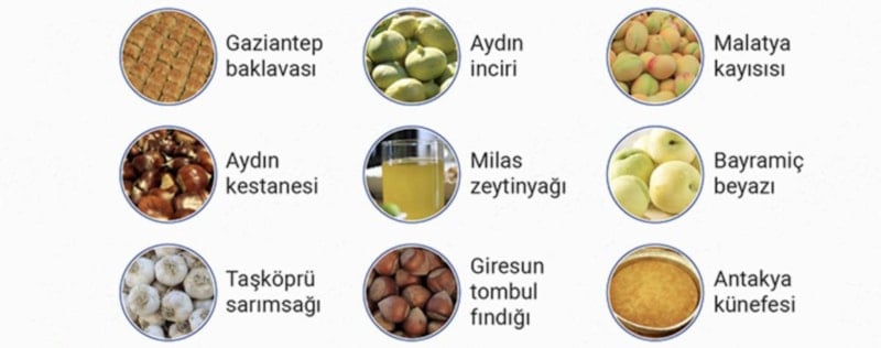 Gaziantep baklavası, Aydın inciri, Malatya kayısısı, Aydın kestanesi, Milas zeytinyağı, Bayramiç beyazı, Taşköprü sarımsağı, Giresun tombul fındığı, Antakya künefesi, Suruç narı, Çağlayancerit cevizi, Gemlik zeytini, Edremit zeytinyağı, Milas yağlı zeytini, Ayaş domatesi, Maraş tarhanası, Edremit Körfezi yeşil çizik zeytini, Ezine peyniri, Safranbolu safranı, Aydın memecik zeytinyağı, Araban sarımsağı, Osmaniye yer fıstığı, Bingöl balı, Bursa şeftalisi, Hüyük çileği, Bursa siyah inciri, Söke pamuğu, Manisa mesir macunu, Gaziantep menengiç kahvesi, Silifke yoğurdu, Aydın memecik zeytini, Erzincan tulum peyniri, Aydın çam fıstığı, Afyon pastırması, Afyon sucuğu, Gaziantep fıstık ezmesi, Mut zeytinyağı, Kırkağaç kavunu.