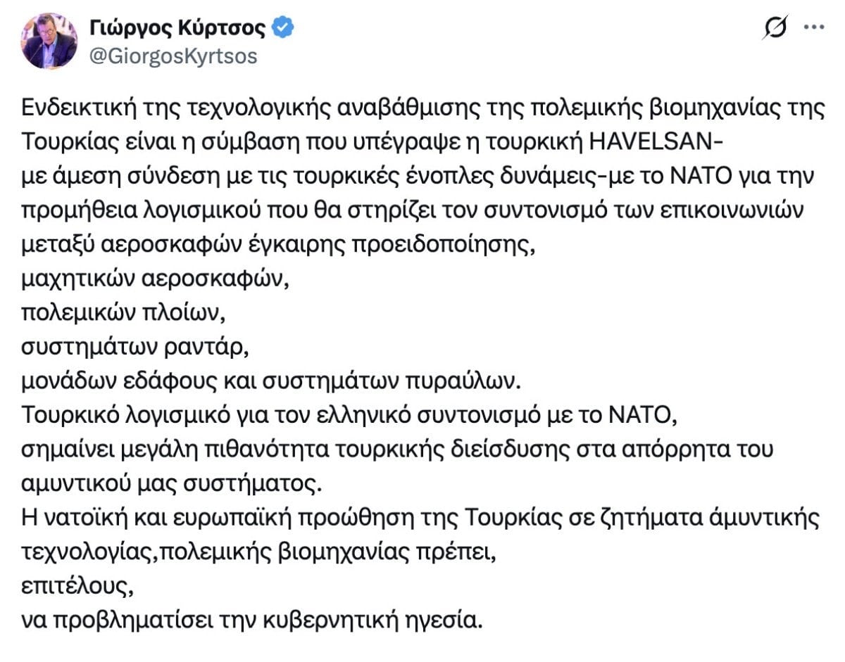 HAVELSAN'ın NATO ile yazılım anlaşmasına dikkati çeken Kyrtsos, bu durumun Yunanistan'ın savunma sırları için bir risk oluşturabileceğini iddia etti.