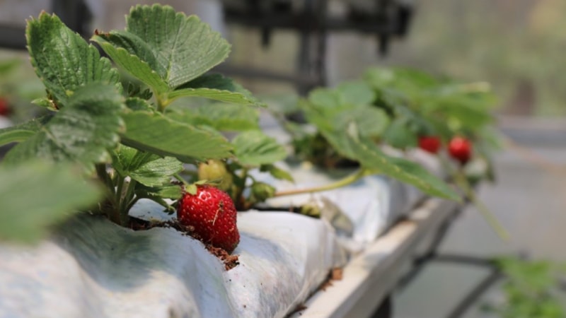 Topraksız çilek üretiminin mümkün kılan serada ilçedeki lise öğrencileri ve kadın çiftçiler de eğitim alabiliyor.