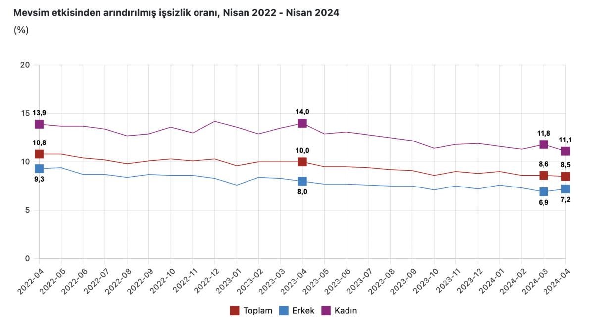 Hanehalkı İşgücü Araştırması sonuçlarına göre; 15 ve daha yukarı yaştaki kişilerde işsiz sayısı 2024 yılı Nisan ayında, bir önceki aya göre 18 bin kişi azalarak 3 milyon 42 bin kişi oldu.