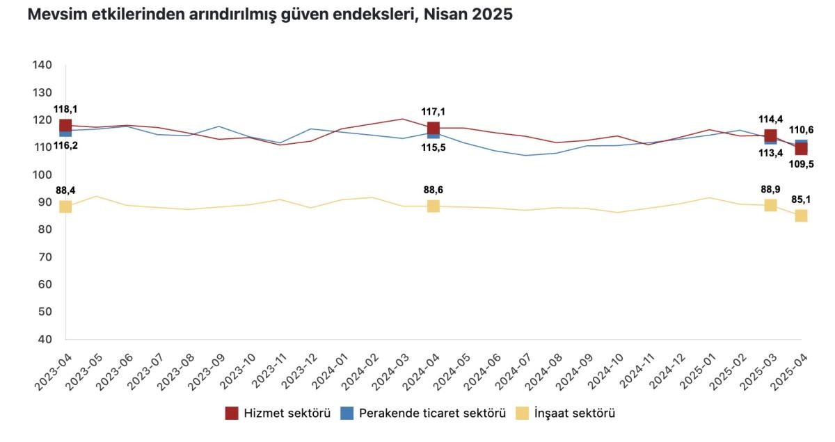 Güven endeksi nisanda, geçen aya kıyasla hizmet sektöründe yüzde 4,3, perakende ticaret sektöründe yüzde 2,5 ve inşaat sektöründe yüzde 4,2 azaldı.