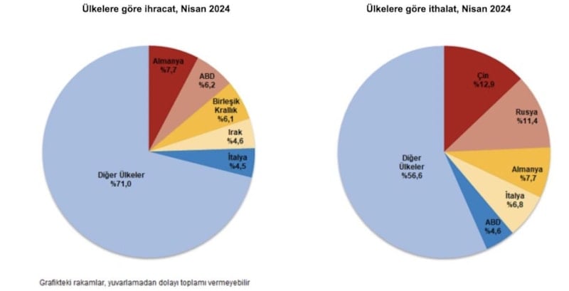 İthalatta Çin ilk sırayı aldı. Nisan ayında Çin'den yapılan ithalat 3 milyar 754 milyon dolar olurken, bu ülkeyi sırasıyla; 3 milyar 327 milyon dolar ile Rusya Federasyonu, 2 milyar 242 milyon dolar ile Almanya, 1 milyar 984 milyon dolar ile İtalya, 1 milyar 331 milyon dolar ile ABD izledi. İlk 5 ülkeden yapılan ithalat, toplam ithalatın yüzde 43,4'ünü oluşturdu.