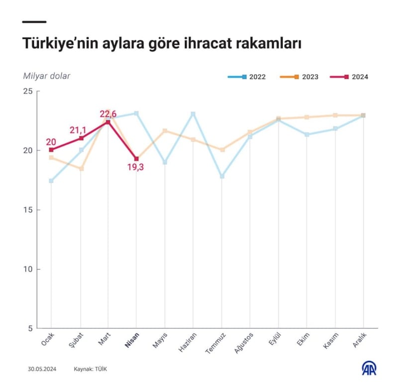 Türkiye İstatistik Kurumu ile Ticaret Bakanlığı iş birliğiyle genel ticaret sistemi kapsamında üretilen geçici dış ticaret verilerine göre; ihracat 2024 yılı Nisan ayında, bir önceki yılın aynı ayına göre yüzde 0,1 artarak 19 milyar 254 milyon dolar, ithalat yüzde 4,0 artarak 29 milyar 117 milyon dolar olarak gerçekleşti.