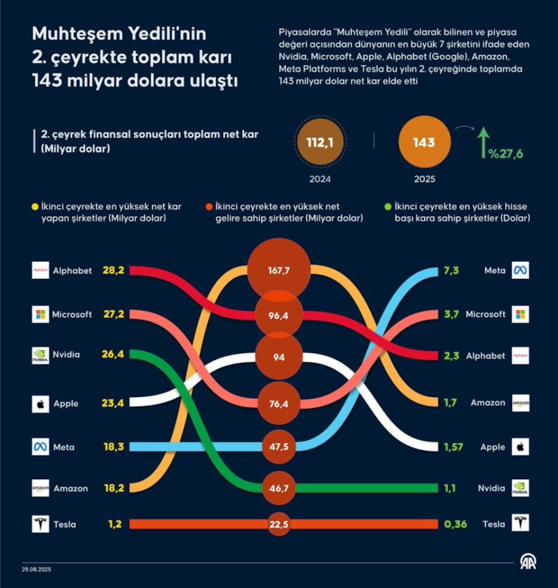 "Muhteşem Yedili" olarak bilinen ve piyasa değeri açısından dünyanın en büyük 7 şirketini ifade eden Nvidia, Microsoft, Apple, Alphabet (Google), Amazon, Meta Platforms ve Tesla, bu yılın 2. çeyreğinde toplamda yüzde 27,6 artarak 143 milyar dolar net kâr elde etti.