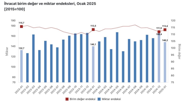 İhracat birim değer endeksi ocak 2025'te aynı kaldı. İhracat miktar endeksi ise ocakta yüzde 5,8 arttı.