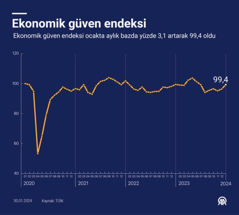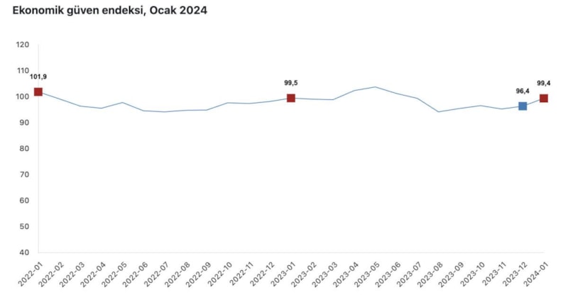 Ekonomik güven endeksi Aralık ayında 96,4 iken, ocak ayında yüzde 3,1 oranında artarak 99,4 değerini aldı.