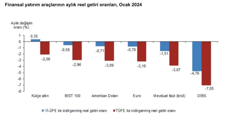 Türkiye İstatistik Kurumu (TÜİK), finansal yatırım araçlarının ocak ayı reel getiri oranlarını açıkladı.