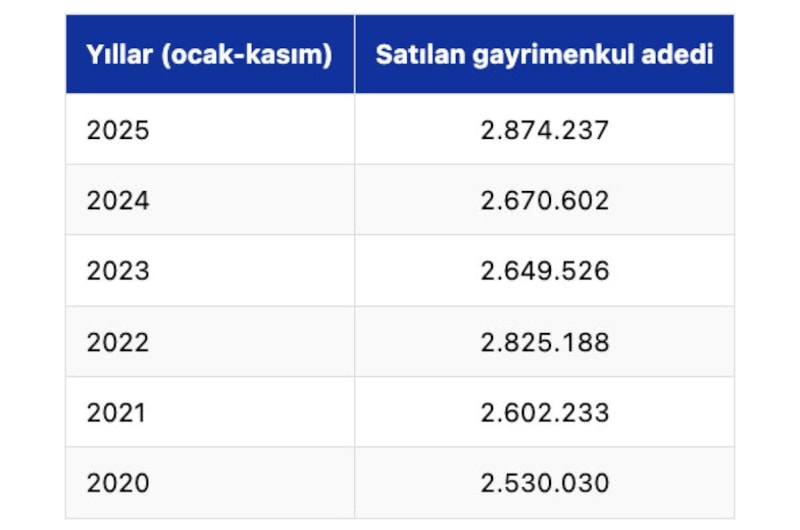 Ülke genelinde 2020-2025 yılları ocak-kasım dönemleri dikkate alındığında satılan gayrimenkul adetleri şöyle: