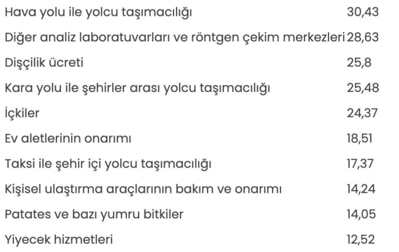 TÜİK'e göre, geçen ay hava yolu ile yolcu taşımacılığındaki fiyat artışını yüzde 28,63 ile diğer analiz laboratuvarları ve röntgen çekim merkezleri, yüzde 25,80 ile dişçilik ücreti izledi.